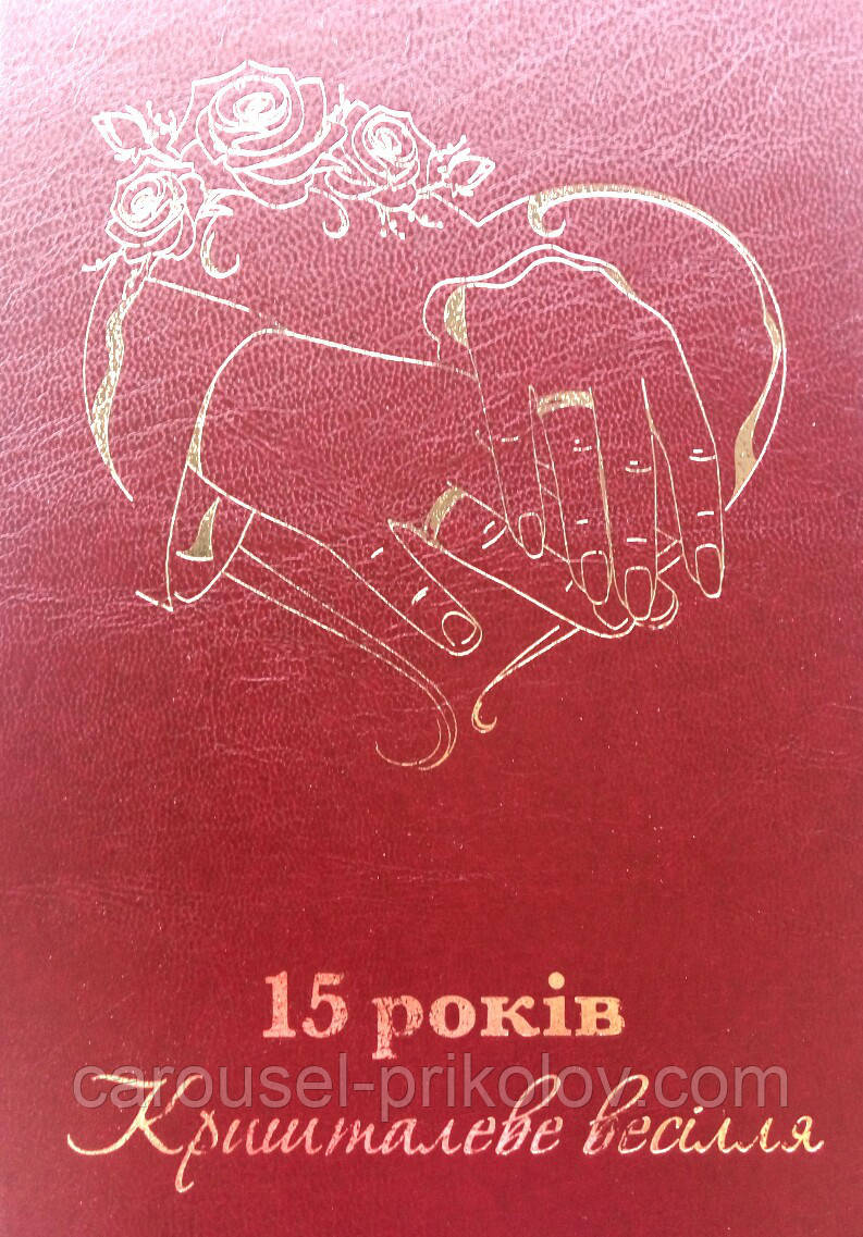 Диплом Кришталеве весілля 15 років буде гарним доповненням до святкування знаменої події в житті двох закоханих сердець. Диплом виготовлений з картону, який обтягнутий вінілом. На лицьовому боці нанесений малюнок та напис "15 років Кришталеве весілля" золотистого кольору. В середині - з лівого боку - святковий вірш, а з правого - місце для запису імен молодих, а також відзнаки записані у веселій, жартівливій формі.